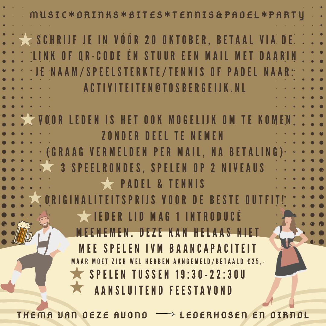 Een avond tennissen en padellen (3 speelrondes op 2 niveaus van 19.30 tot 22.30 uur), muziek, drinks & bites en aansluitend een gezellige feestavond voor € 25,- all in!