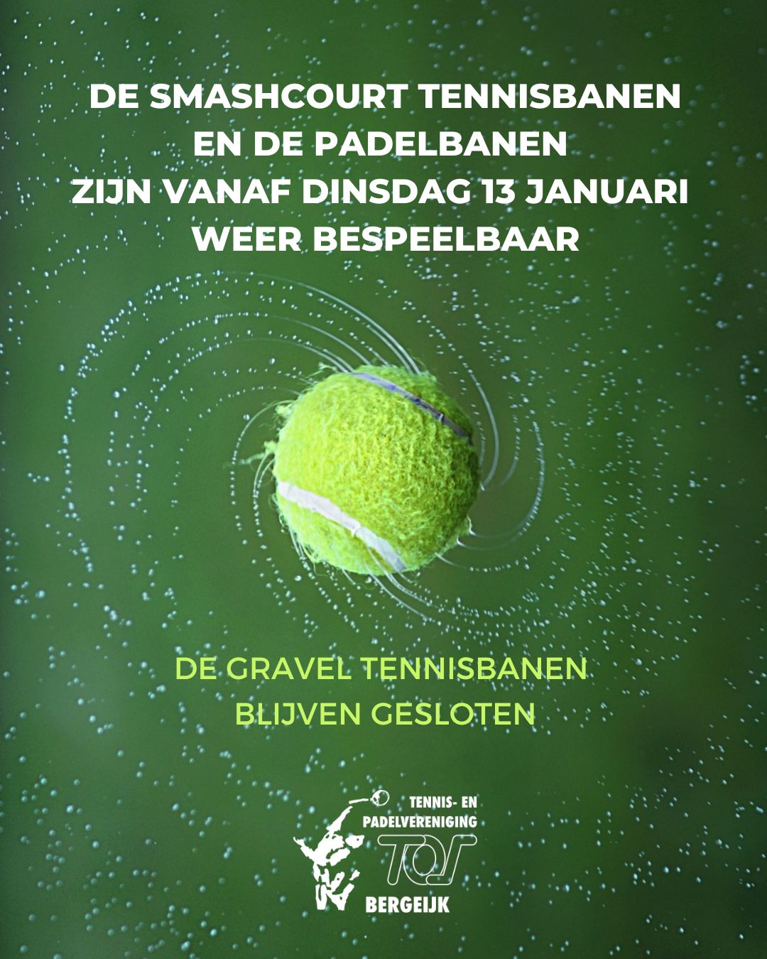 De smashcourt tennisbanen en de padelbanen zijn vanaf 13 januari weer bespeelbaar. De gravel tennisbanen blijven gesloten.
